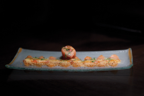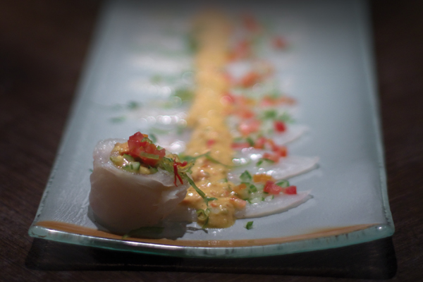 Tiradito criollo acompañado con caipiroshka de sake y maracujá.