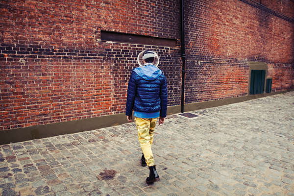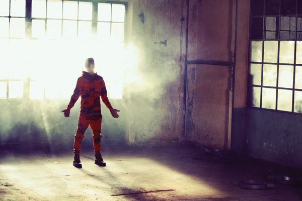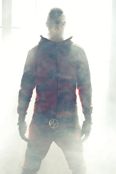Una reciclada fábrica se tiñe de un espeso humo grisáceo cuando él aparece con su impactante traje camouflage y máscara de acrílico transparente…