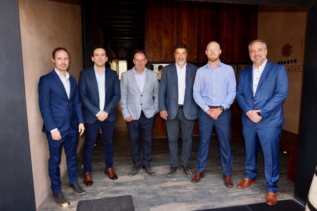 Los cofundadores delas bodegas Riglos Hurpe, Dario Werthein y los hermanos Toso. Brindan por el éxito de la inaguración y emplazamiento del Fragmento del Muro de Berlin intervenido colocado y abierto al publico en el kilómetro 32 de la Ruta Provincial 15, Lujan de Cuyo, Mendoza.