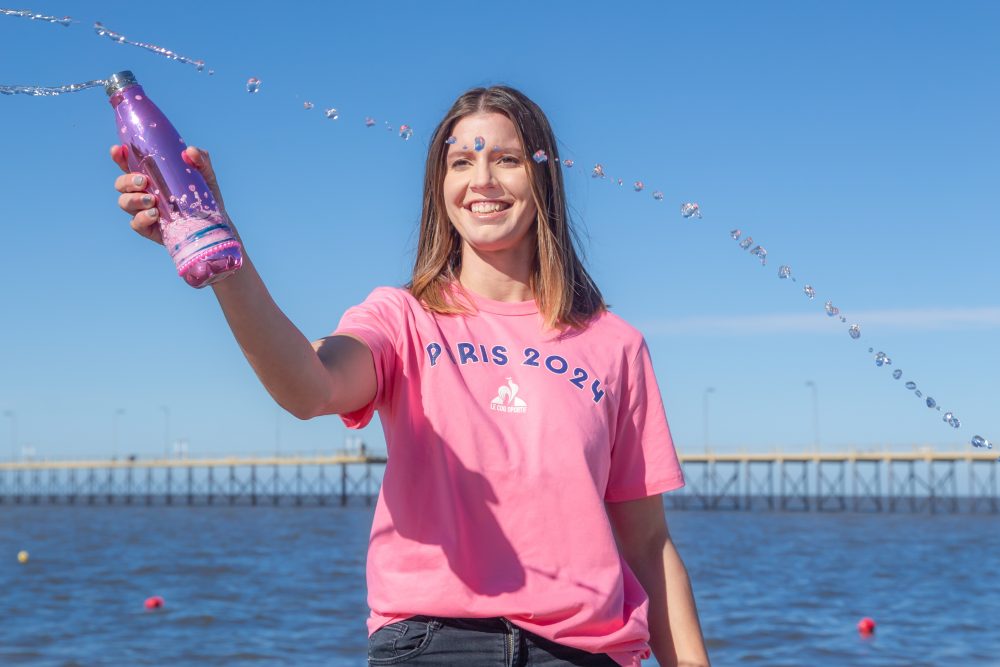 La botella de agua rosa, intervenida por la artista Belen Gasualdo une a todas las distintas deportistas de varias disciplinas ya que el agua es vida, y la hidratación es un aspecto fundamental de la salud que todo el mundo entiende y practica. Al usar la botella rosa como símbolo y elemento de union entre todas las deportistas, –fue intervenida por la artista plastica Belen Gesualdo quien trabajo en técnica Mixta con vidrio líquido para representar la pureza, renovación y vitalidad. Eligio como material las piedras brillantes que representan la luz y la fortaleza-, se busca transmitir de manera efectiva que así como la hidratación es esencial para el bienestar diario, también lo es la detección temprana del cáncer de mama. Esto crea una conexión clara y fácil de recordar entre el cuidado diario y la importancia de los chequeos regulares, haciendo que el mensaje de prevención sea aún más poderoso.
