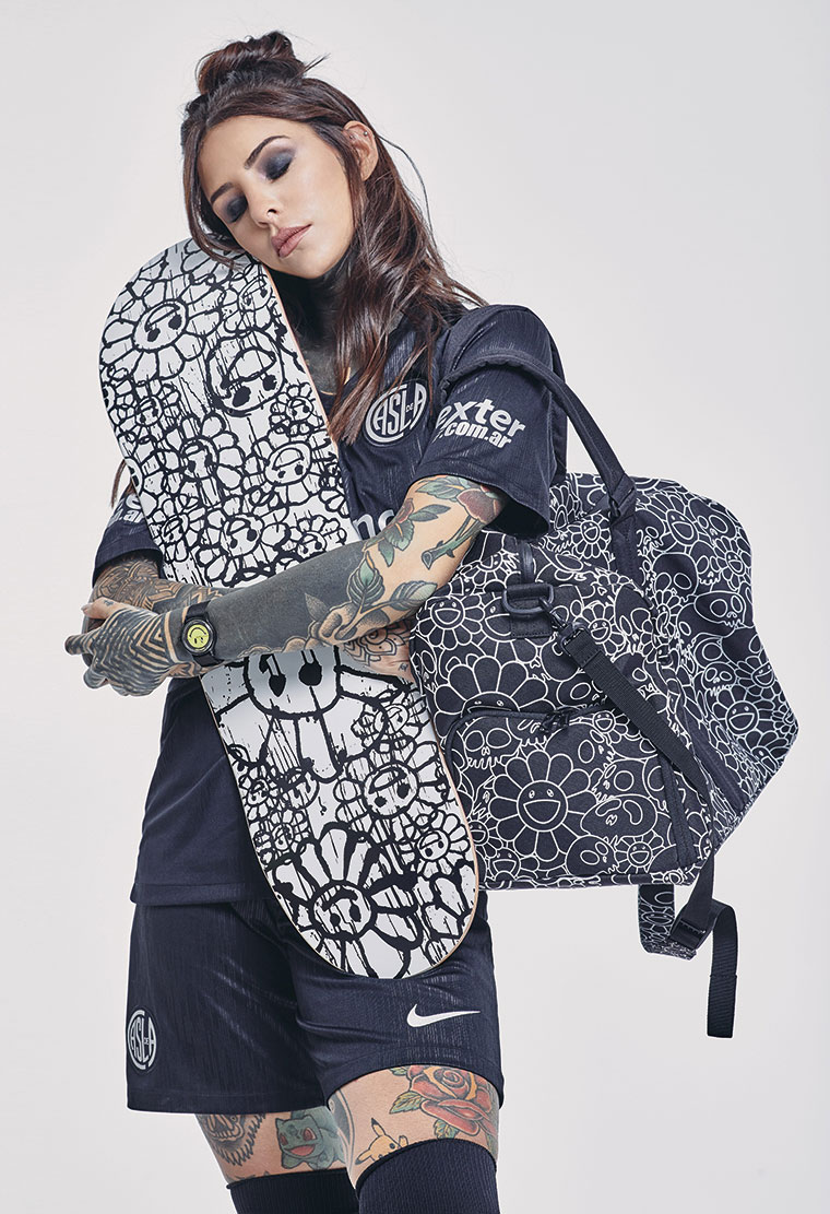 camiseta aternativa de San lorenzo “Piel de Cuevo” x Nike, short negro Casla x Nike Football, medias Nike Football negras con swoosh blanco, reloj Smile Chinatown Market x Timex, skate Madsaki basado en el los Flowers de Takashi Murakami para Kaikai Kiki, bolso negro con flores y calaveras de Takashi Murakamipara Kaikai Kiki x Herschel Supply