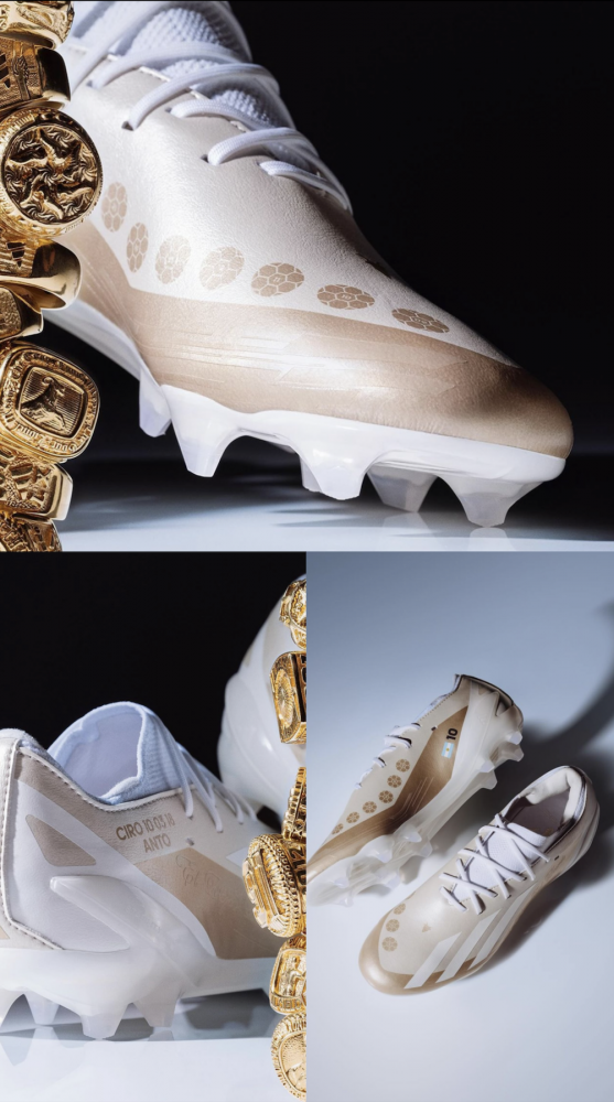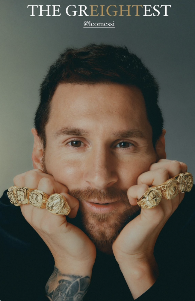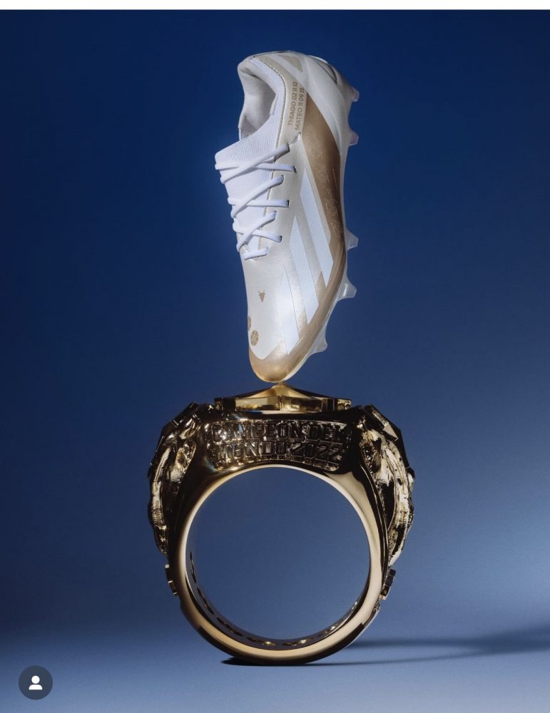 Este año Leo Messi ganó junto a la selección Argentino la copa del mundo Quatar 2022 transformándolo en el indiscutido G.O.A.T ( GREATEST OF ALL TIME) o » El más grande todos los tiempos» y al romper el récord del Octavo Balón de Oro , Adidas Football le obsequió 8 anillos que representan sus logros en le futbol, sus raíces e iconos como sus botines y varios detalles de la iconografía Argentina.