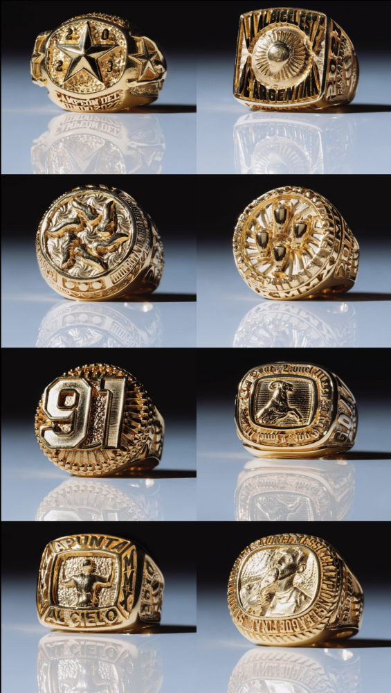 Detalle de los 8 anillos que Adidas Football le entregó a Leo Messi por su Octavo Balón de Oro y con botines, frases, e iconografía Argentina que ejemplifican sus logros, copas y orígenes.