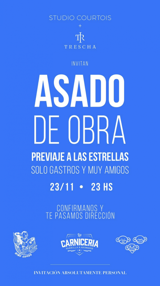 La Guia Michelin desembarcó en Buenos aires y Mendoza finalmente y Studio Courtois de Picky Courtois junto al chef Tomas Treschanski que cedió su nuevo lugar en Palermo donde realizará un nuevo bistro, la sabiduría del asado de German Sitz co-responsable de los restaurantes La Carnicería, Niño Gordo, Dorado, Jadin del Museo Fernandez Blanco y Chori y se sumaron los chicos del bar Tres Monos con una barra movil, para agasajar a los chef, gastronómicos, dueños, periodistas y amigos en un Asado de Obra con cascos amarillos incluidos para el deleite de todos. Solo amigos y gastro era la consigna!