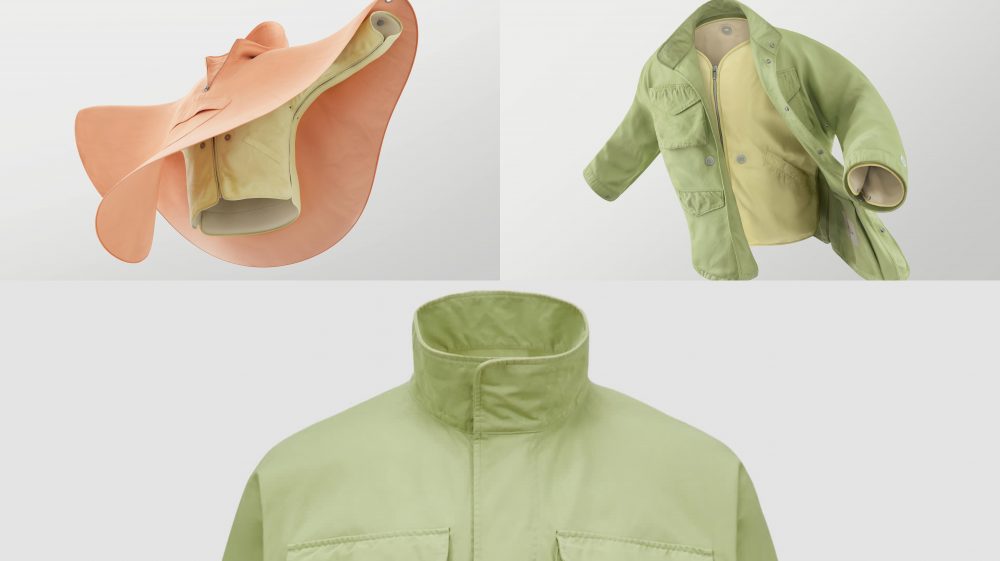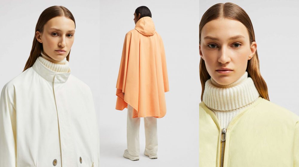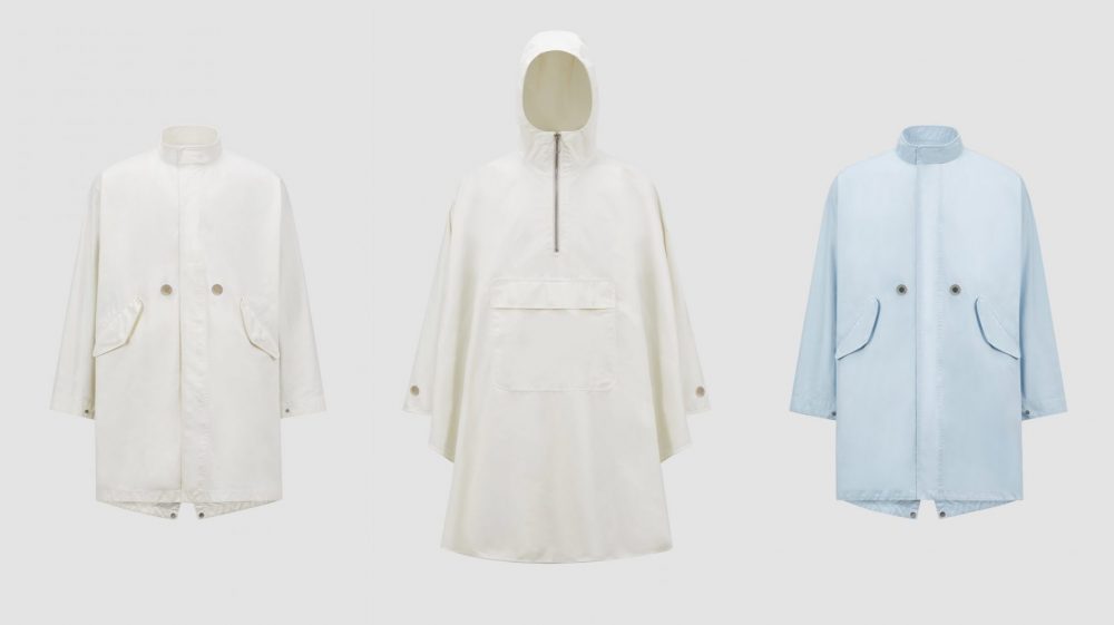 El diseño se inspiró en el desarrollo innovador de Moncler de un nuevo nailon reciclado de alta calidad. Desarrollado exclusivamente para la colaboración LoveFrom, las fibras teñidas en hilo se han taslanizado – un tratamiento en el que el aire comprimido texturiza el hilo dándole un aspecto mate y el aspecto de una fibra natural. El tejido se fabricó en telares inusualmente grandes, lo que permite que cada prenda se fabrique a partir de una sola pieza de tela que se pliega de manera sencilla. La colección es un sistema de tres capas que se conectan a un núcleo central.