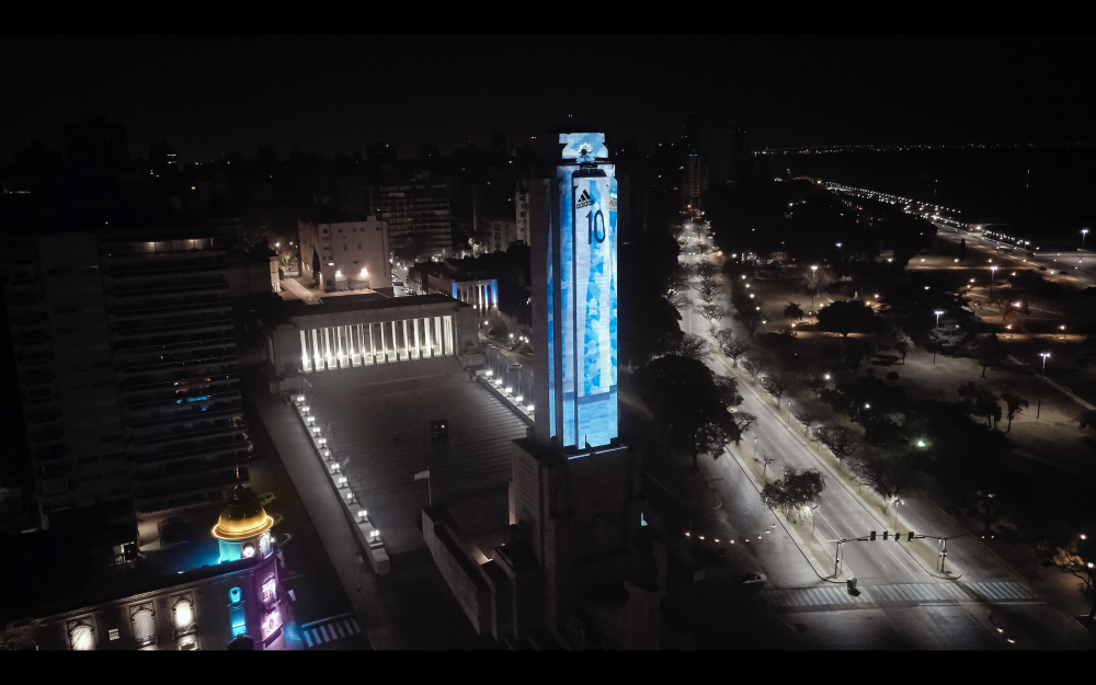 Argentina Vs Brasil. Adidas aprovecho el Día de la Bandera y vistió al Monumento a la Bandera de Rosario en honor a la camiseta de su hijo prodigo Lionel Messi N 10 de la selección