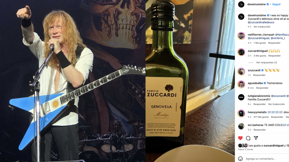 David Scott Mustaine, más conocido como Dave Mustaine, es un músico estadounidense, conocido por ser el fundador, guitarrista, vocalista y principal compositor de la banda de thrash metal Megadeth, así como por ser anteriormente guitarrista de la banda Metallica. Y gracias a la efusividad de los fans argentinos en sus show cantando «Aguante Megadeth! «. Ahora se le suma su nueva guitarra con el celeste y blanco y su admiración por el aceite de Oliva y los vinos de Familia Zuccardi de Mendoza.