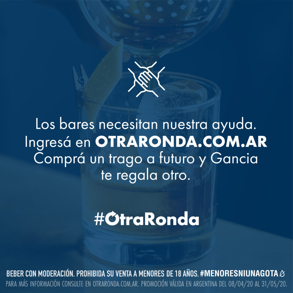 #OtraRonda, la iniciativa a través de la cual GANCIA estará colaborando con los bares de todo el país. Para ayudar a estos que cerraron sus puertas para que puedan seguir abiertos y en servicio cuando termine la cuarentena. La idea es que podamos comprar un trago a “futuro” y cuando termine la cuarentena se pueda disfrutar en tu bar preferido y celebrar con amigos y de paso ayudar a toda la gente que trabajaba en ellos.