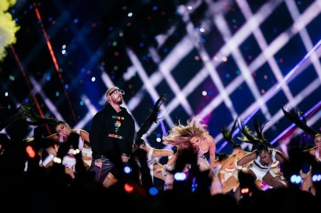 El cantante J Balvin fue el zenit del show de Jlo en el entretiempo del Superbowl en la ciudad de Miami cuando se sumo en un megamix de su hit Que calor junto a Major Lazer (sampleando a Toto La Mompasina) y el hit Mi Gente con el remix de Steve Aoki. Y en sus pies lució sus propias Air Jordan 1 multicolor con logo smiley del disco Energía del colombiano.