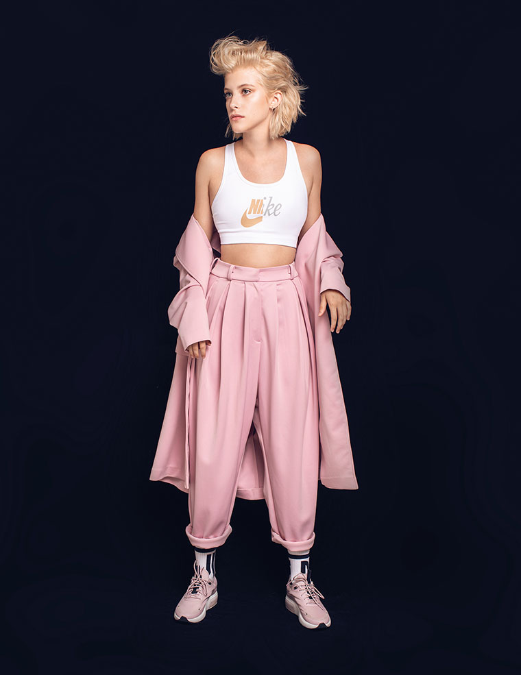 top sports bra Nike blanco con logos en plateado y dorado sacón rosa y pantalones Nous Etudions x Romina Cardillo, medias Nike Sportswear Just Do it, zapatillas Nike Air Max Dia rosa
