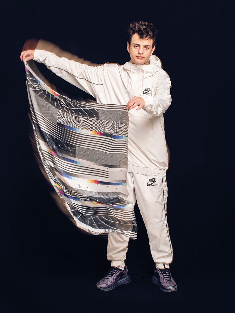 mono Nike Sportswear Tech Pack, collar Dover Street Market Los Angeles, ghettoblaster blanco Lansonic 1984, medias Nike Sportswear negras, zapatillas Nike Air Max Dia blancas. ghettoblaster dorado Lansonic 1984, head band, blanco y negro Nike Training, mono Nike Sportswear Nike Air, collar Teclado remix, medias Nike Sportswear negras, zapatillas Nike Air Max 720 Aurora Borealis