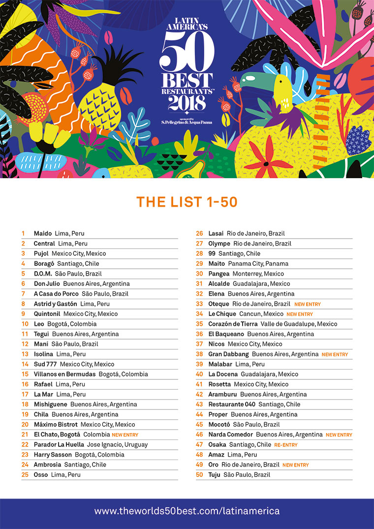 En 2018, los Latin America’s 50 Best Restaurants recibieron 6 nuevas entradas: El Chato, restaurante del país anfitrión, Colombia, con sede en Bogotá, que también recibió el premio Highest New Entry al ocupar el Nº 21 de la lista de este año. Oteque, el restaurante de Río de Janeiro, entró en la lista con el puesto Nº 33; en el Nº 34 está Le Chique, restaurante en Cancún, México; Gran Dabbang, de Buenos Aires, Argentina, ocupa el lugar Nº 38; mientras que el restaurante Narda Comedor entró a la lista en el lugar Nº 46 y Nº 49 es Oro, el restaurante en Río de Janeiro, Brasil, que ganó el premio One To Watch en 2017.