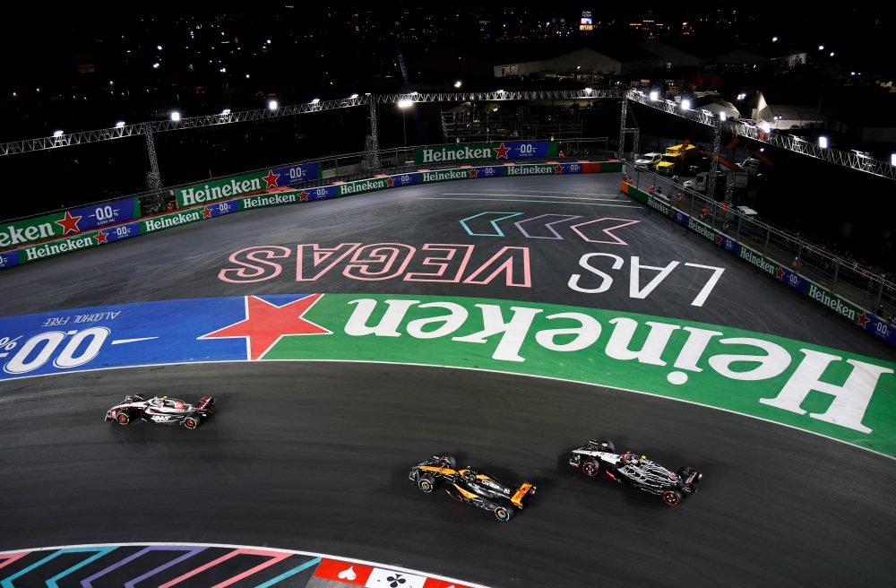 LAS VEGAS, NEVADA – NOVEMBER 18: Nico Hulkenberg of Germany driving the (27) Haas F1 VF-23 Ferrari leads Oscar Piastri of Australia driving the (81) McLaren MCL60 Mercedes and Yuki Tsunoda of Japan driving the (22) Scuderia AlphaTauri AT04 on track during the F1 Grand Prix of Las Vegas at Las Vegas Strip Circuit on November 18, 2023 in Las Vegas, Nevada. (Photo by Chris Graythen/Getty Images) // Getty Images / Red Bull Content Pool // SI202311190120 // Usage for editorial use only //