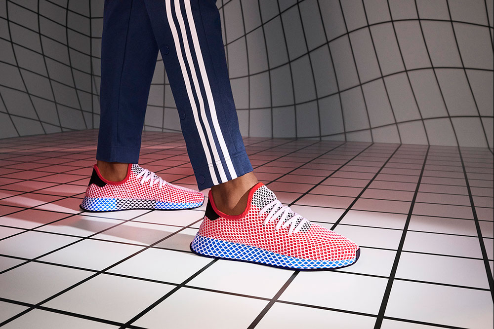 Deerupt sostiene la cuadrícula como su principio de diseño central envolviendo la zapatilla entera. Inicialmente presentada en las siluetas de running de adidas en los 80 presenta una construcción ultraligera y con grado alto de entalle para asegurar el pie, asegurando el máximo confort.
