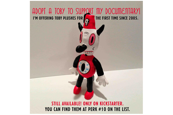 El peluche Toby por fin está disponible después de nueve largos años, en exclusiva para este proyecto documental. Usted puede adoptar Toby con la donación a la campaña de Kickstarter de Gary Baseman para «Criaturas Míticas». La campaña de Kickstarter tiene como objetivo recaudar fondos para la base y el equipo de filmación de viajar a Ucrania para completar la documentación de las personas y los lugares en los que la familia del artista, una vez prosperó durante generaciones.