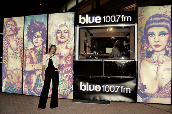 Anita Álvarez de Toledo junto a las obras del genial ilustrador chileno Fab Ciraolo en el espacio de Blue 100.7 fm.