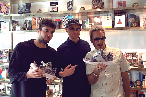 Los músicos Dante Spinetta y Emmanuel Horvilleur de la banda IKV, festejando sus dos Grammys Latinos junto al diseñador de las zapatillas Nike Rosche Two, Dylan Raasch, en Casa Cavia.