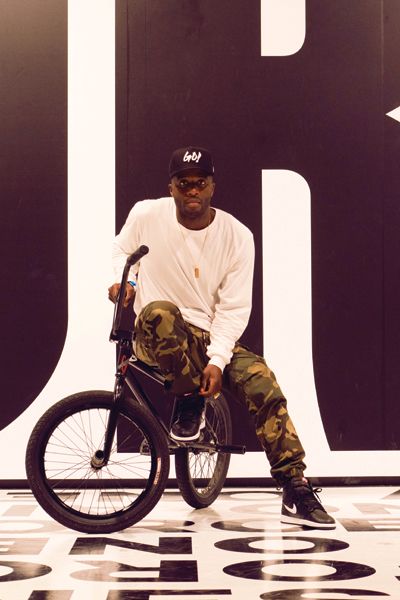 El rider Nigel Sylvester con su bici en la cancha de basket de las AF1.