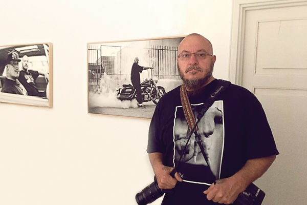 El fotógrafo Estevan Oriol estuvo visitando Herencia Studios, y posó junto al retrato que le sacó Pablo Franco en LA con su Harley.