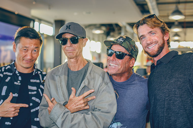 El diseñador japonés Satoshie Takenaka, el artista Craig Stecyk III, Bob Hurley y el tres veces ganador del US Open Surf Brett Simpson.