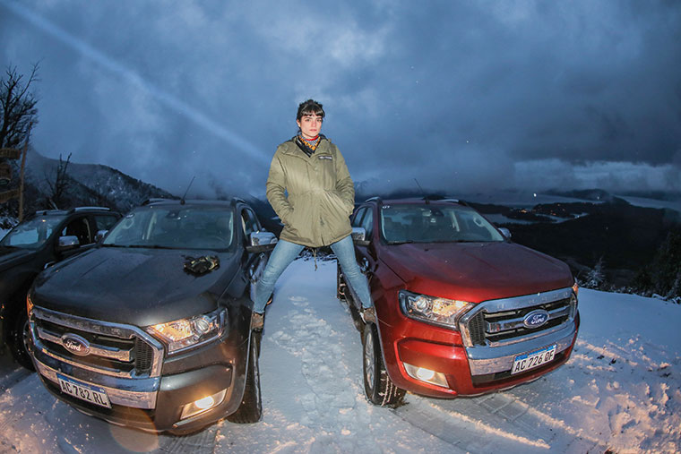 Male Sanchez desafía las montañas arriba de dos Ford Ranger en Bariloche en el Ford Ranger Experience.