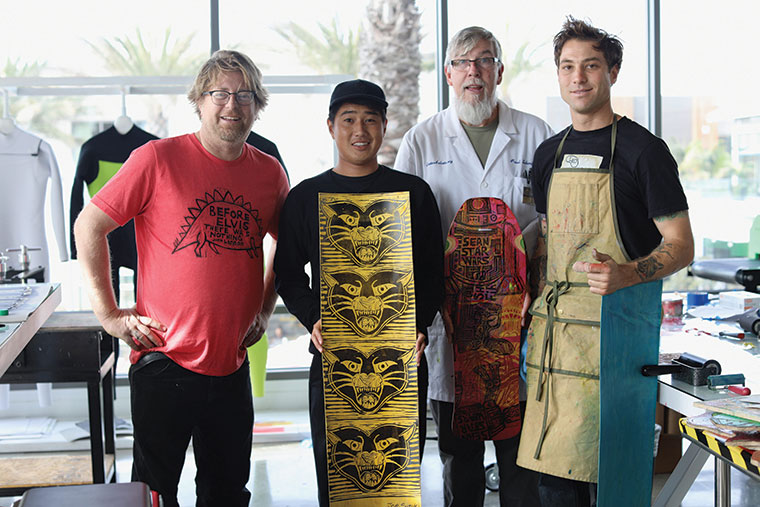 Sean StarWars junto a Joe Suzuki, Professor Schmitt y J.P. Olson en Hurley Printing Press de Pacific City en Huntington Beach.