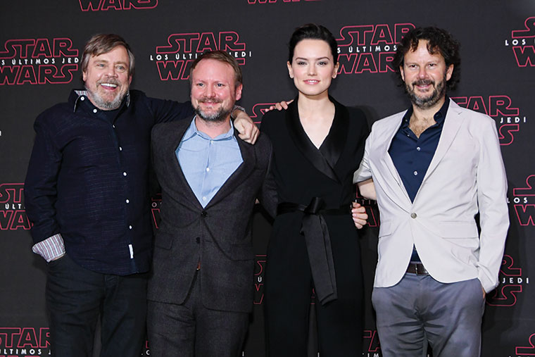 Hamill (Luke), el director Rian Johnson, la actriz británica Daisy Ridley (Rey) y el productor Ram Bergman en el Fan Event Black Carpet, en México.