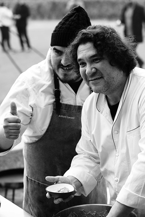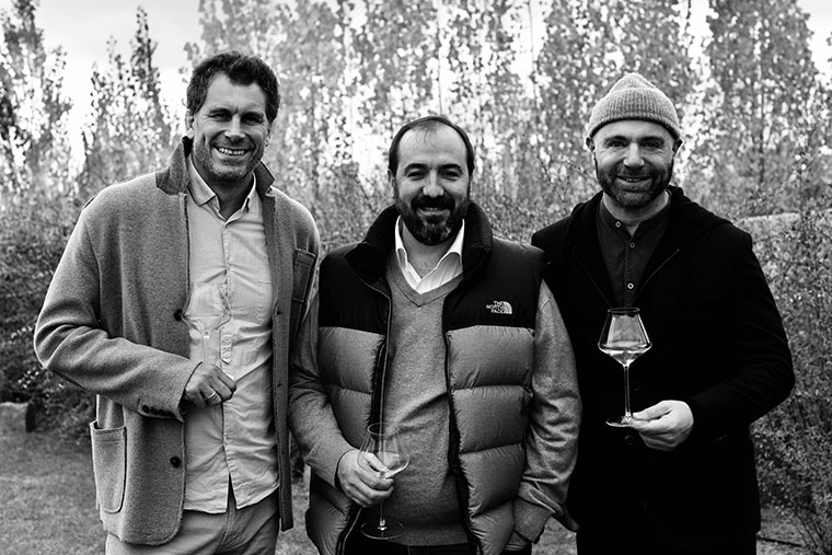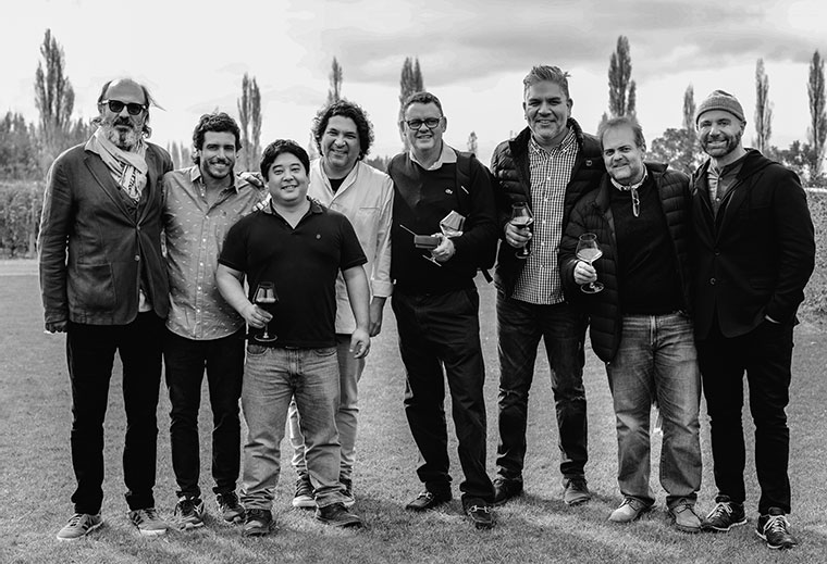 Los chefs Martin Pittaluga (Parador La Huella Jose Ignacio), Sebastian Zuccardi, German Martitegui (Tegui Buenos Aires), Mitsuharo Maido (Maido Lima), Gaston Acurio (Astrid y Gaston Lima), Rodolfo Angenscheidt (Restaurante Tierra Colorada Asunción), Jose del Castilo (Isolina Lima), Harry Sasson (Bogota Colombia), German Martitegui (Tegui Buenos Aires) en la Bodega Piedra Infinita.