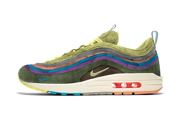 Su Air max 97 hidrídos originalmente diseñadas por Christian Tresser pero remixeada por Sean con la inspiración de varios modelos entre que resaltamos el verde de las dunk Ugly Duckings de 1992 y aunque realizado en una gama de suave terciopelo, no podemos dejar de pensar también en varias horribles alfombras de aeropuertos de medio Estados Unidos.