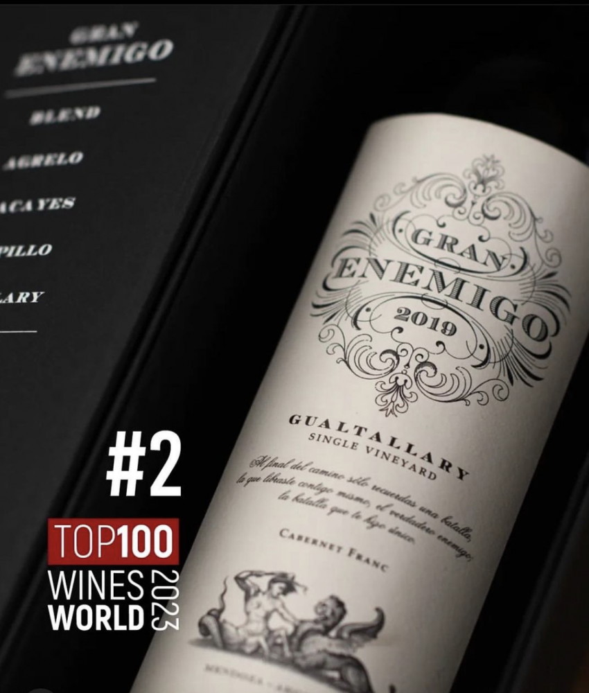 Fue en edición 2023 de los Top 100 Wines World, el ranking que destaca a los mejores vinosde todo el mundo, a cargo del especialista estadounidense James Suckling Acaba de revelarse la lista de los Top 100 de Wine Spectator basados en calidad, valor, disponibilidad y entusiasmo. El Enemigo Cabernet Franc Agrelo Single Vineyard obtuvo el puesto 73 de la lista.