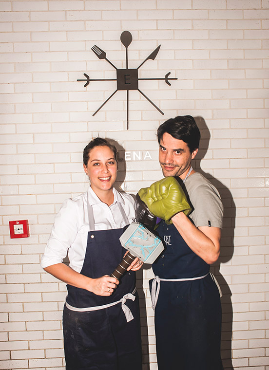 Pía León y Virgilio Martíne chefs del restaurante Central de Lima, Perú, junto al martillo de Thor Ragnarok y la increible manos de Hulk!