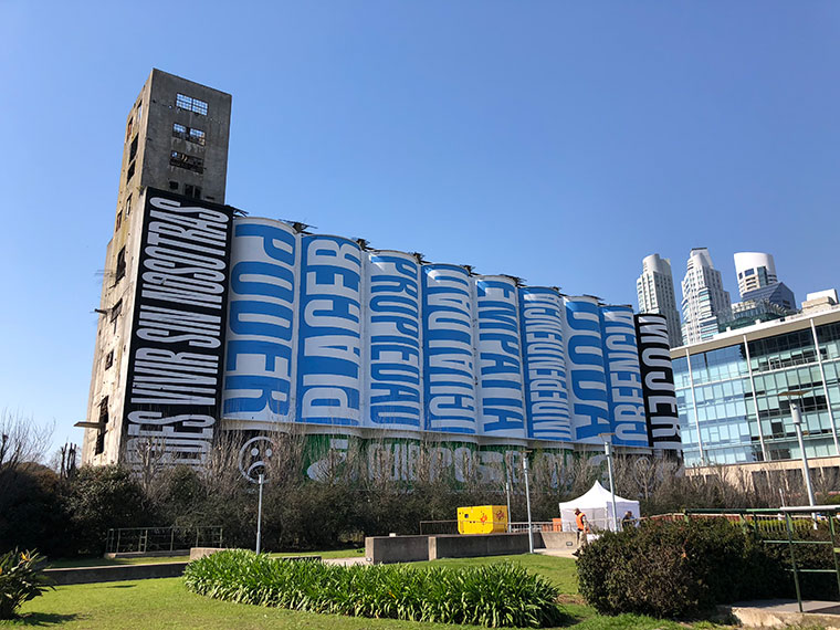 -Barbara Kruger (EE.UU.) – Sin Título (no podés vivir sin nosotras) – Pintura mural en silos (obra monumental) – Desde el JUEVES 6 de septiembre, toda la semana y más – Plaza Reina de Holanda, Silos de la antigua Junta Nacional de Granos (Olga Cosettini 750/799, Puerto Madero).