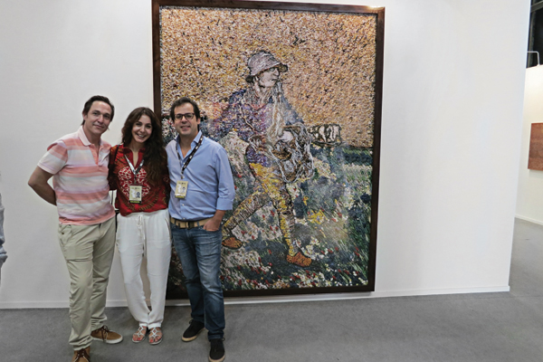 Gustavo Clauss junto a Bia Rosa y Daniel Roesler de la Galería Nara Roesler de San Pablo con un cuadro Vik Muniz detrás.