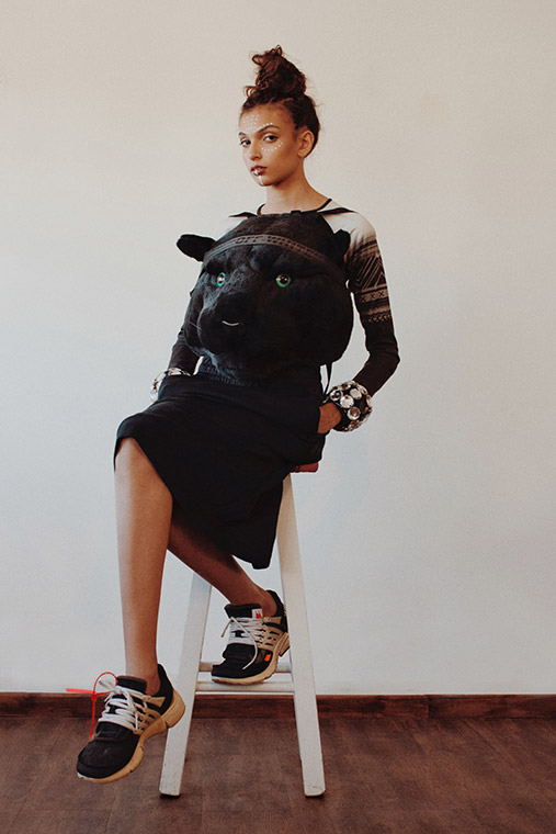 top Nike Sportswear, mochila Pantera Negra remix, cinturón Off-White por Virgil Abloh, falda Nike Sportswear, zapatillas Nike Presto x Virgil Abloh #TheTen, pulseras de strass Ksk