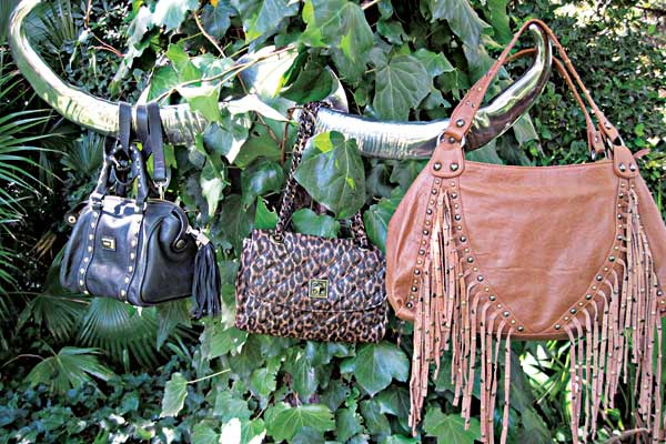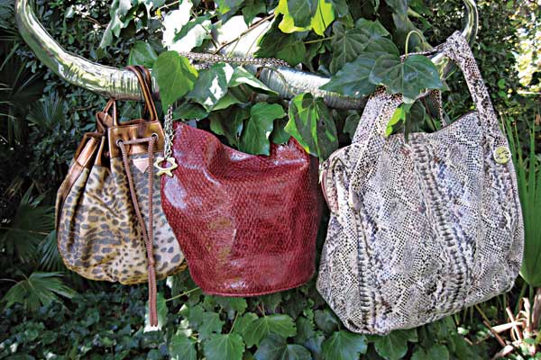 Baulito de cuero con tachas y flecos, cartera animal print en matelassé y cartera CUOIO con flecos y tachas Prüne