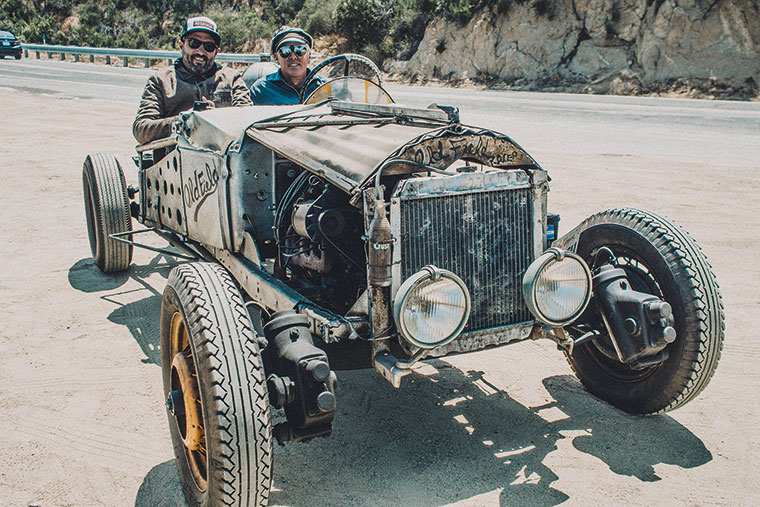 El artista Brian Bent en su Rat Rod custom basado en un Ford 39 camino al parque que da sobre Lake Elsinorl donde se encuentra la pista de carreras en motos Elsinore Grand Prix, donde corria Steve McQueen en moto en la película Any Given Sunday.