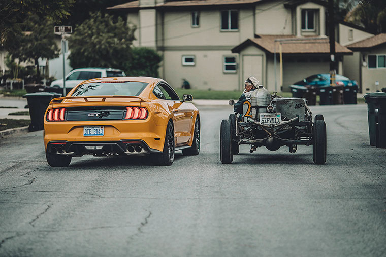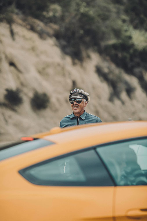 Brian, los riders de Herencia y el Mustng GT liderando la caravana hacia Dana´s Beach para ir a surfear