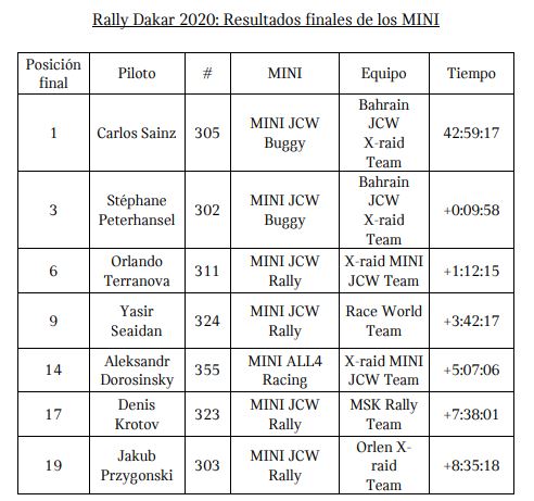 Stéphane Peterhans el y su copiloto Paulo Fiuza finalizaron terceros, a 9:58 minutos detrás de Sainz y Cruz, completando una impresionante presentación para los MINI John Cooper Works Buggy. En total, entre ambos MINI JWC Buggy se alzaron con cuatro etapas, mientras que los vehículos MINI fueron los más rápidos en un total de nueve de los doce días. Siete de los nueve equipos de MINI que comenzaron el rally llegaron a la meta en Al-Quiddia (KSA), y cuatro de ellos finalizaron entre los diez primeros. El argentino Orlando Terranova, navegado por Bernardo ‘Ronnie’ Graue, culminó en sexto lugar en la general a bordo del MINI JCW Rally con tracción en las cuatro ruedas. Los vehículos MINI encabezaron la clasificación general después de cada una de las doce etapas en la 40° puesta en escena del Rally Dakar. Zala y Jurgelenas ya habían mostrado el potencial de los MINI cuando obtuvieron la primer etapa en su MINI JCW Rally después de lo cual, Terranova y Graue tomaron la delantera general el segundo día. Sainz y Cruz ganaron la tercera etapa escalando a la primera posición de la clasificación general, lugar que ocuparon hasta el final de la competencia.