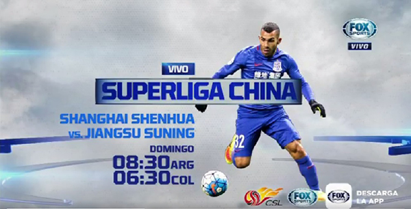Carlos Tevez vuelve a la pantalla de Fox Sports #TevezxFOX 03/03/2017 by Staff Leave a comment Este Domingo 5 de Marzo a las 8.30 AM, FOX SPORTS emitirá Shanghai Shenhua VS Jiangsu Suning de la Superliga China por FOX Sports y su APP. El Relato del encuentro estará a cargo de Gustavo Cima con comentarios de Javier Tabares.