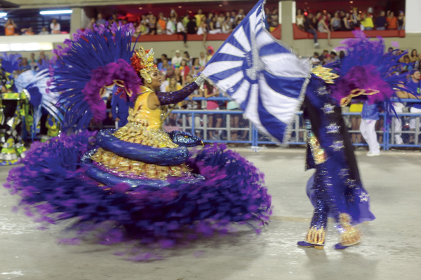 La bailarina llevando la bandera que identifica a la Escola portelas.
