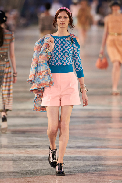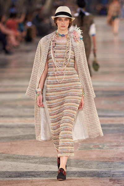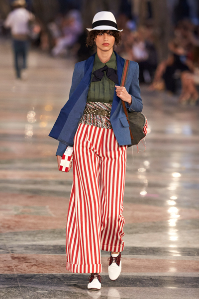 El sol poniente haloed los leones vigilantes con el oro; el espectáculo comenzó con un pasaje inicial afirmando una de las principales siluetas de crucero: masculino-femenino, terriblemente elegante con un toque de sinvergüenza. Una chaqueta larga masculina sobre anchos pantalones con vuelta, zapatos de dos colores planos, camisa ceñida con la tela, sombrero de Panamá por la Maison Michel inclinado sobre raffishly mirada altiva de Stella Tennant. En este espíritu de la modernidad en negrita, de la feminidad juvenil, el «vestido de debutante» según Karl Lagerfeld es de júbilo: una falda de volantes con gradas en un organza bordada adorno de la hoja, lo que contrasta con una chaqueta lío usado sobre una camisa blanca con corbata.