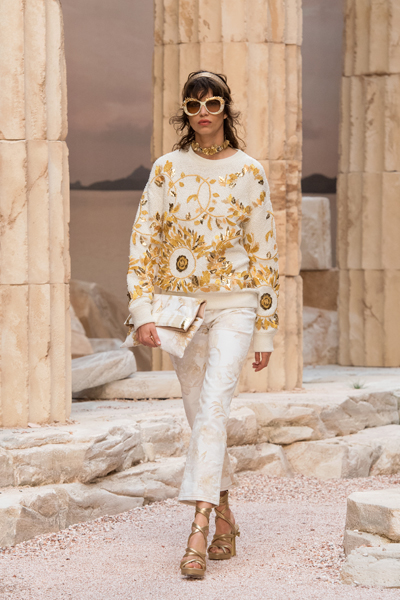 Con esta colección, Karl Lagerfeld compone un verdadero recorrido a través del tiempo y el espacio. Deslumbrante cascada azul cicládica blanca y vívida sobre los vestidos del juego y las chaquetas de la A-línea en tweed tejido, iluminando un traje icónico con las caderas curvaceous, amphora-como. La antigüedad se encuentra con la mitología de la moda moderna en tops de jersey cubierto, faldas largas, pantalones anchos, fluidos y plisados por el sol en negro, blanco y beige o terracota y oro. El tweed pálido o ocre franjado, sin forro se forma en las capas amplias del crossover y los vestidos de la shepherdess de la cremallera cinturón con un cordón de oro-anillado. La simplicidad de los vestidos de lino se eleva con bordados de piedras multicolores. El reino de la mitología está siempre presente: las diosas griegas aparecen en vestidos literalmente esculpidos, en crepe inmaculado, con sus cinturas marcadas bordadas enteramente en lentejuelas que emulan mármol.