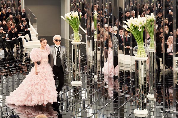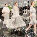 Por la noche, las siluetas están envueltas en radzimir, duquesa de raso, organza y tafetán, encaje flocado y laminado, tul, jacquard y georgette. El bordado floral perlado y las brillantes piedras talladas brillan en los vestidos de la vaina y ésos con volúmenes más generosos de vez en cuando permanecen calientes con el tul, las plumas y las estolas del cordón. Vestidos de la envoltura se turnan para ser envuelto en el bordado reflectante de rastrillar el piso, lentejuelas adornado rayas de encaje, o bolas de plumas. Bordados bustiers bordados con flores y hojas rhodoid, grandes faldas y vestidos en tul, escotes profundos y plazas que se sumergen al principio de la cintura y boleros marabú: una delicada y graciosa sensualidad se apodera de esta colección que concluye con la llegada del Embajador de CHANEL Lily Rose Depp que camina por la pista en un vestido de novia compuesto de volantes diáfanos en organza rosa pálido.