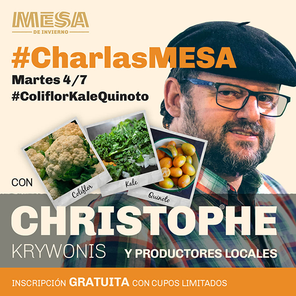 Llevarán adelante la charlaMESA: Christophe Krywonis (chef), Agustín Benito (Productor de kale, Sueño Verde), Eduardo Ciancia (productor de coliflor orgánica, Huerta La Anunciación) y Nicolás Laffatigue (ingeniero agrónomo del INTA, experto en huertas agroecológicas).