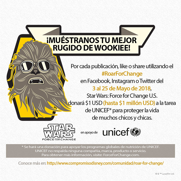 Lucasfilm y Star Wars: Force for Change anunciaron hoy la iniciativa Roar For Change (Rugir por el cambio), un desafío global en apoyo a los programas globales de nutrición de UNICEF. La misma invita al público a compartir su propia versión del icónico rugido de Chewbacca. Por cada publicación, like o share utilizando el #RoarForChange en una cuenta abierta de Facebook, Instagram o Twitter, entre el 3 y el 25 de mayo de 2018, Star Wars: Force for Change de los EE. UU. donará 1 dólar a UNICEF, hasta alcanzar 1 millón de dólares. Los fondos se utilizarán para apoyar el trabajo de UNICEF que salva la vida de niños de todo el mundo. Chewbacca es el protagonista de HAN SOLO: UNA HISTORIA DE STAR WARS, la nueva película de Lucasfilm que estrenará en cines el 24 de mayo, y cuya preventa de entradas comienza mañana, 4 de mayo, en www.Disneylatino.com/peliculas.
