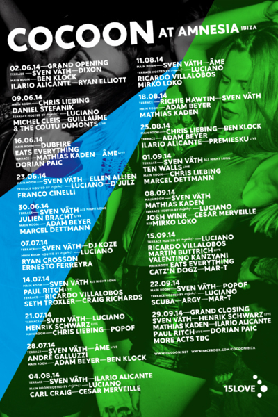 Trabajamos muy duro, pero simplemente no había manera de encajar todo en 17 lunes , Cocoon 15 te trae 18 espectáculos enormes que ofrecen una mezcla poderosa deslumbrante de artistas que mostrar sus talentos en uno de los mejores clubes del mundo : Amnesia .