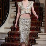 Anna MOUGLALIS, Embajadora CHANEL, llevó un abrigo de tweed gris bordado con piedras, con una falda roja de seda, look 19, de la colección Otoño-Invierno 2016/17 Alta-Costura. Bolso CHANEL.