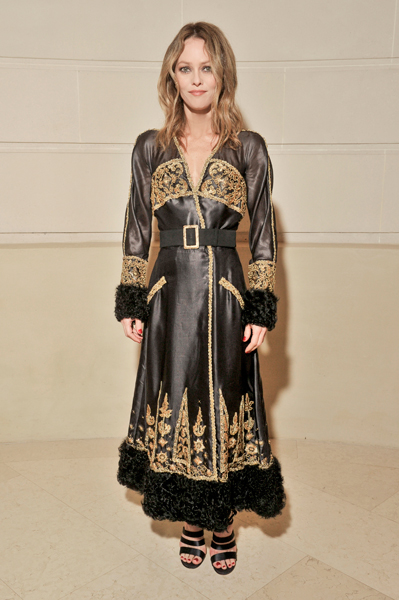 Vanessa PARADIS, Embajadora CHANEL, llevó un abrigo de satín negro bordado, look 63, de la colección Paris- Moscú 2009/10. Accesorios y zapatos CHANEL.