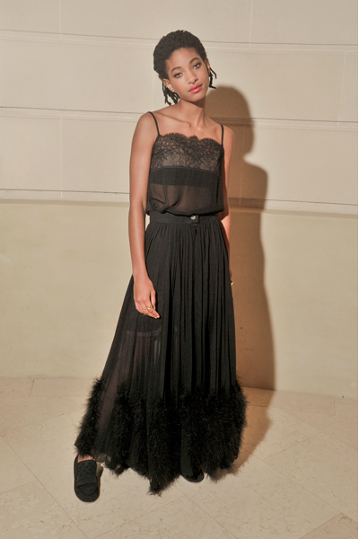 Willow SMITH, Embajadora CHANEL, llevó una falda negra de seda bordada con plumas y una blusa de seda negra con encaje, look 54, de la colección Primavera-Verano 2017 Ready-To-Wear. Zapatos CHANEL.