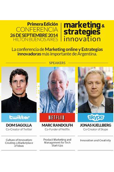 La primera edición de “Digital Marketing Conference” cambia de día y anuncia la nueva fecha del evento el viernes 26 de septiembre. A Dom Sagolla -Co-Creador de Twitter-, se sumarán Marc Randolph -Co-Fundador de Netflix-, y Jonas Kjellberg -Co-Creador de Skype- quienes serán los primeros invitados a participar de la conferencia “Marketing online y estrategias innovadoras”.